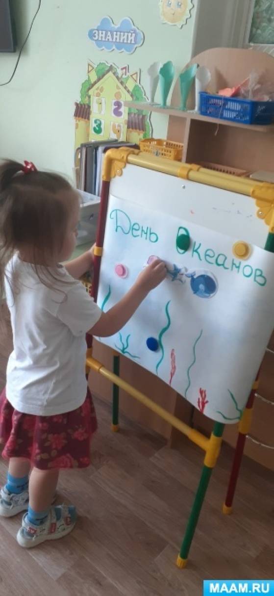 Отгадывали интересные загадки в ходе которых ребята совместно выполнили коллективную работу «Морские обитатели». Дети с удовольствием расселяли их в «подводном мире». Украсили фойе группы своей работой. И в конце дня получили в подарок раскраски.