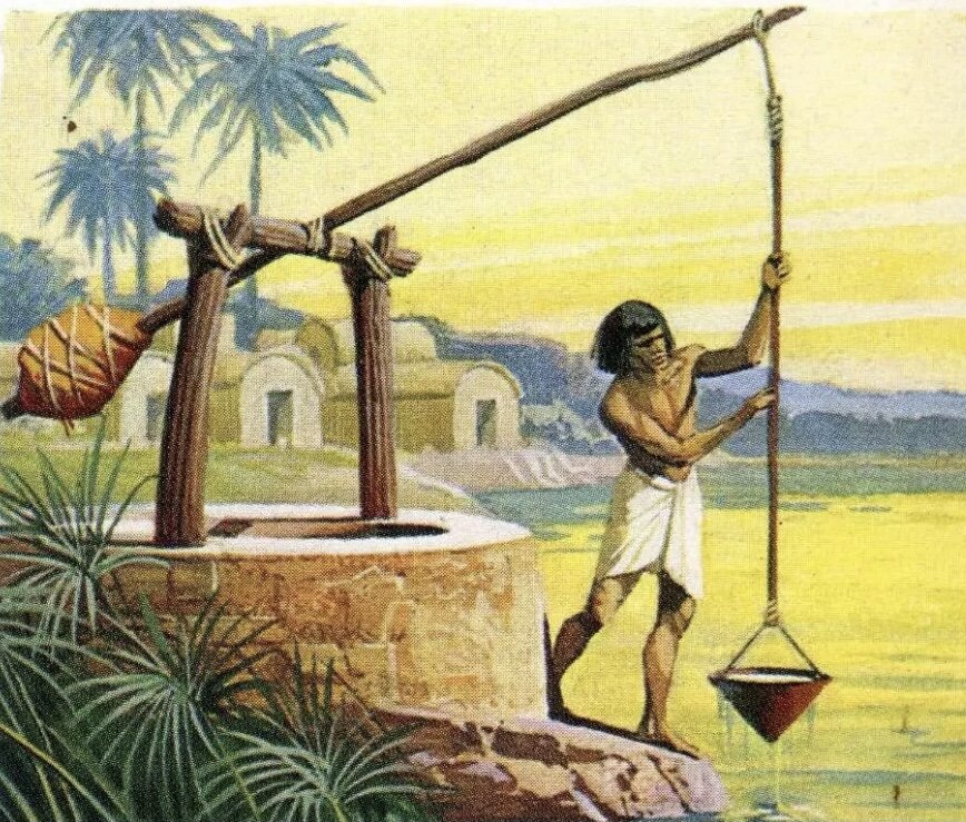 | Полный ответ – 3б., частичный 1-2 балла. | 3. На иллюстрации изображен египетский земледелец, он хочет полить посевы. Приспособление для полива называется шадуф. Шадуф — это простое устройство, которое, по сути, представляло собой рычаг с противовесом. Длинная деревянная жердь с кожаным ведром на одном конце и противовесом в виде камня на другом. Данное изобретение применялось для подъема воды и тяжелых грузов. |
