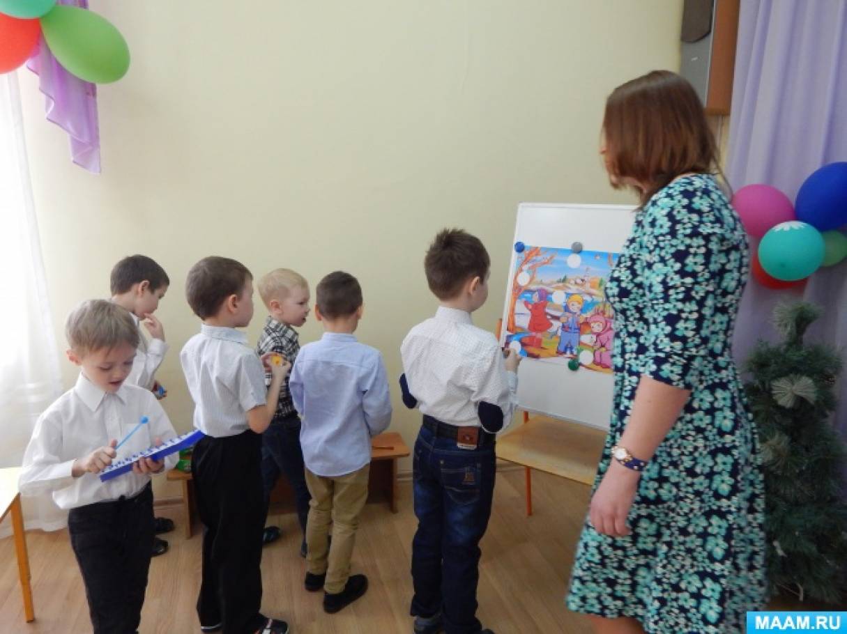 После того, как дети составят картинку и сыграют на своем инструменте, Весна просит их сыграть в оркестре. Дети садятся на стульчики.