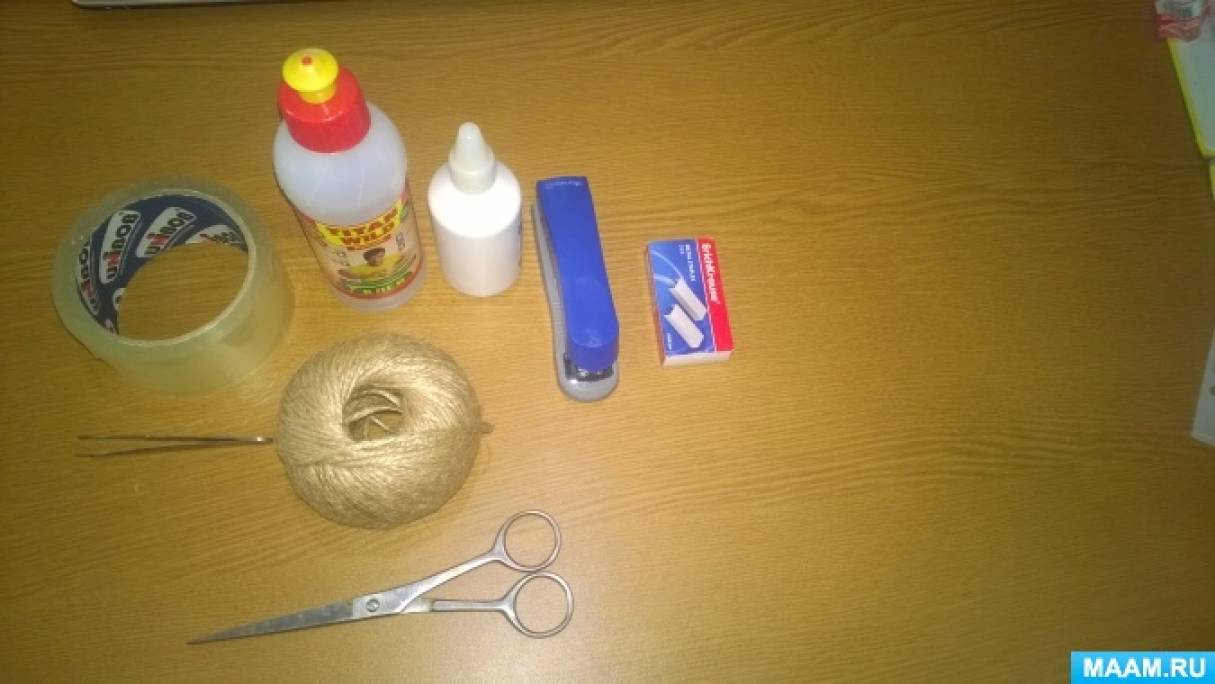 1. | Для работы потребуется: 1.Джутовый шпагат, 2. Бумажный стаканчик, 3. Карандаш, резинка, линейка, 4.Клей- карандаш, 5.Двухсторонний скотч, 6.Ножницы, 7. Проволока, 8. Тесьма. | |