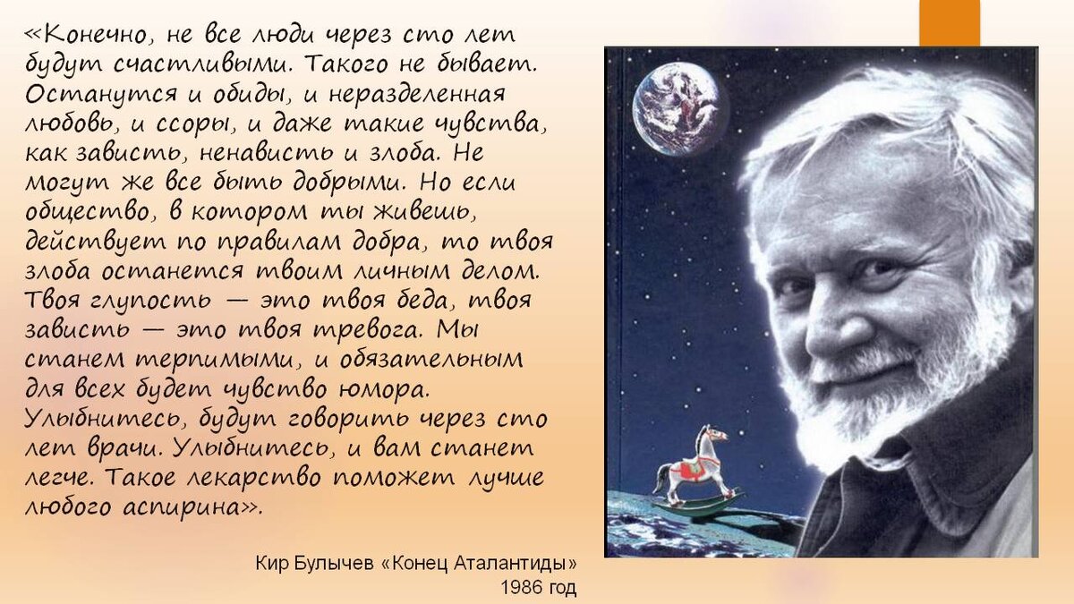 - Добрый день! Уважаемые ребята, гости! Сегодня мы вновь говорим о писателях-юбилярах. Героем нашего библиотечного урока станет замечательный писатель-фантаст XX века, интересный человек, творивший под псевдонимом Кир Булычёв. 18 октября 2024 года любимому автору могло бы исполниться 90 лет. Книги Кира Булычёва оставили большой след в сердцах его читателей – совсем маленьких и уже взрослых. «Человек, заглянувший в будущее» - такова тема нашей литературной встречи. Книги Кира Булычёва сделали неизведанный, полный тайн и загадок космос ближе к нам, землянам, ведь действие большинства из них происходит в космических лабиринтах Вселенной.