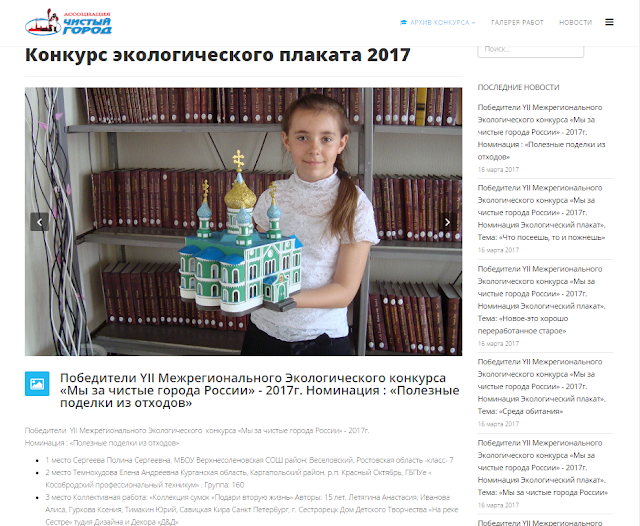 В этом году, в межрегиональном конкурсе Экологического плаката "Мы за чистые города России" (Санкт-Петербург) мы заняли с Сергеевой Полиной, ученицей 7 "Б" класса I место в номинации "Полезные поделки из отходов".