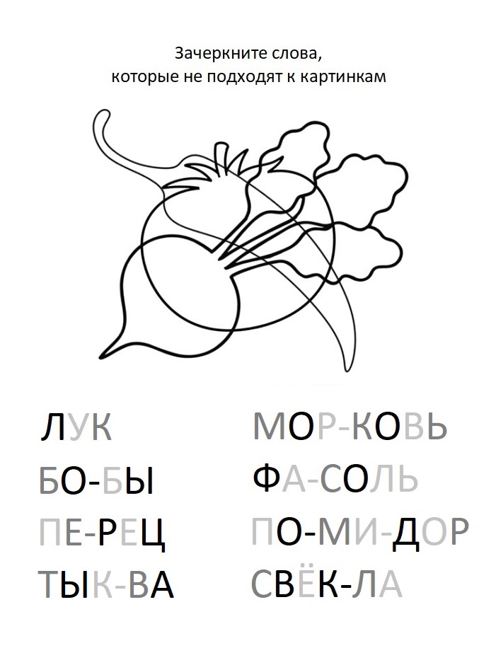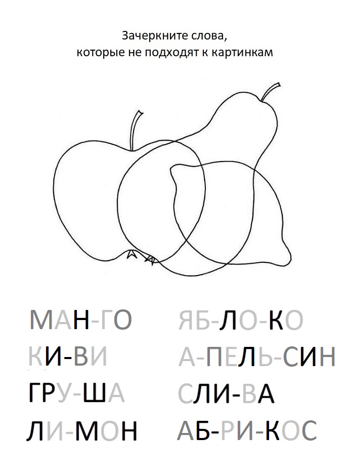 Описание ресурса | Обучающие карточки «Нейрочтение» разработаны по лексическим темам: «Фрукты», «Овощи», «Домашние животные» и «Животные леса». В центре карточки зашумлённое изображение трёх предметов, ниже напечатаны восемь слов, пять слов нужно зачеркнуть, потому что изображений к ним нет. Чтобы выполнить задание, обучающийся должен: 1) распознать предметы на картинке (можно раскрасить их разным цветом); 2) прочитать все слова; 3) соотнести изображения со словами; 4) зачеркнуть лишние слова, к которым нет картинок. Важно! Обучающие карточки можно использовать как для разовой работы, так и многократного применения после ламинирования. Обучающие карточки прикреплены в Приложениях 1,2 (две карточки на одном листе А4). Обучающая карточка№1 («Фрукты»)