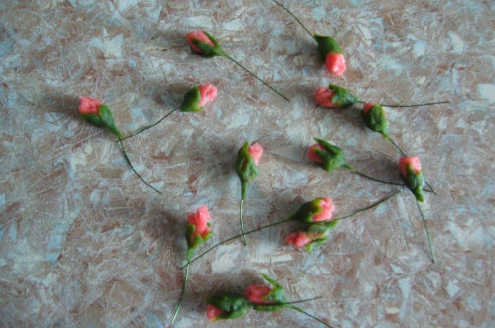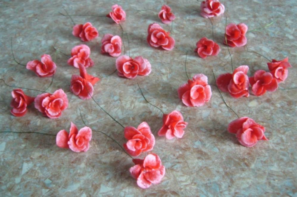 Затем из нежно -розового фарфора делаем заготовки для листочков