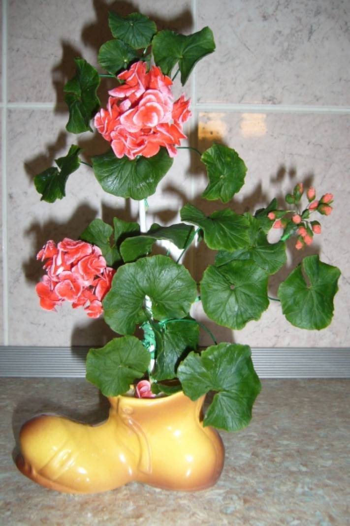 Посмотрите, как великолепно смотрится фиалка созданная своими руками возле настоящей герани.