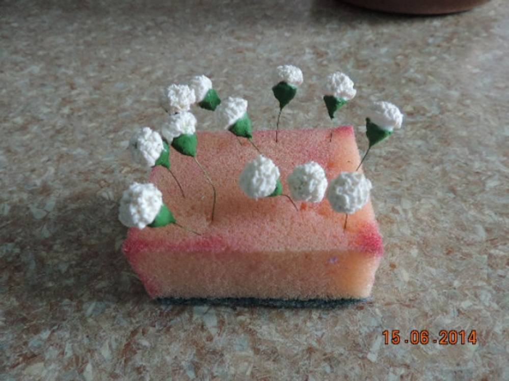 Цветы сохнут сутки-двое. Когда они затвердеют, краем губки, окрашенной в розовый цвет масляной краской, выделим края фиалки