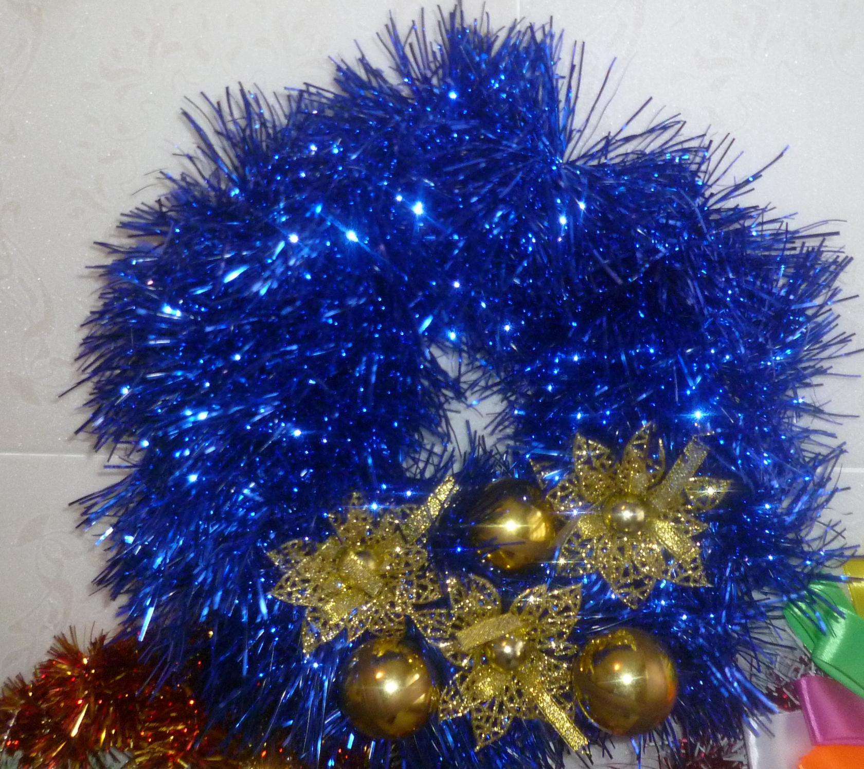 Для декорирования взяли мишуру и елочные игрушки. Сделали каркас из картона в виде бублика. игрушки. На основе закрепили кончик мишуры и ею обмотали все кольцо по кругу. Кончик вновь закрепили. Прикрепили игрушки. И вот веночек.