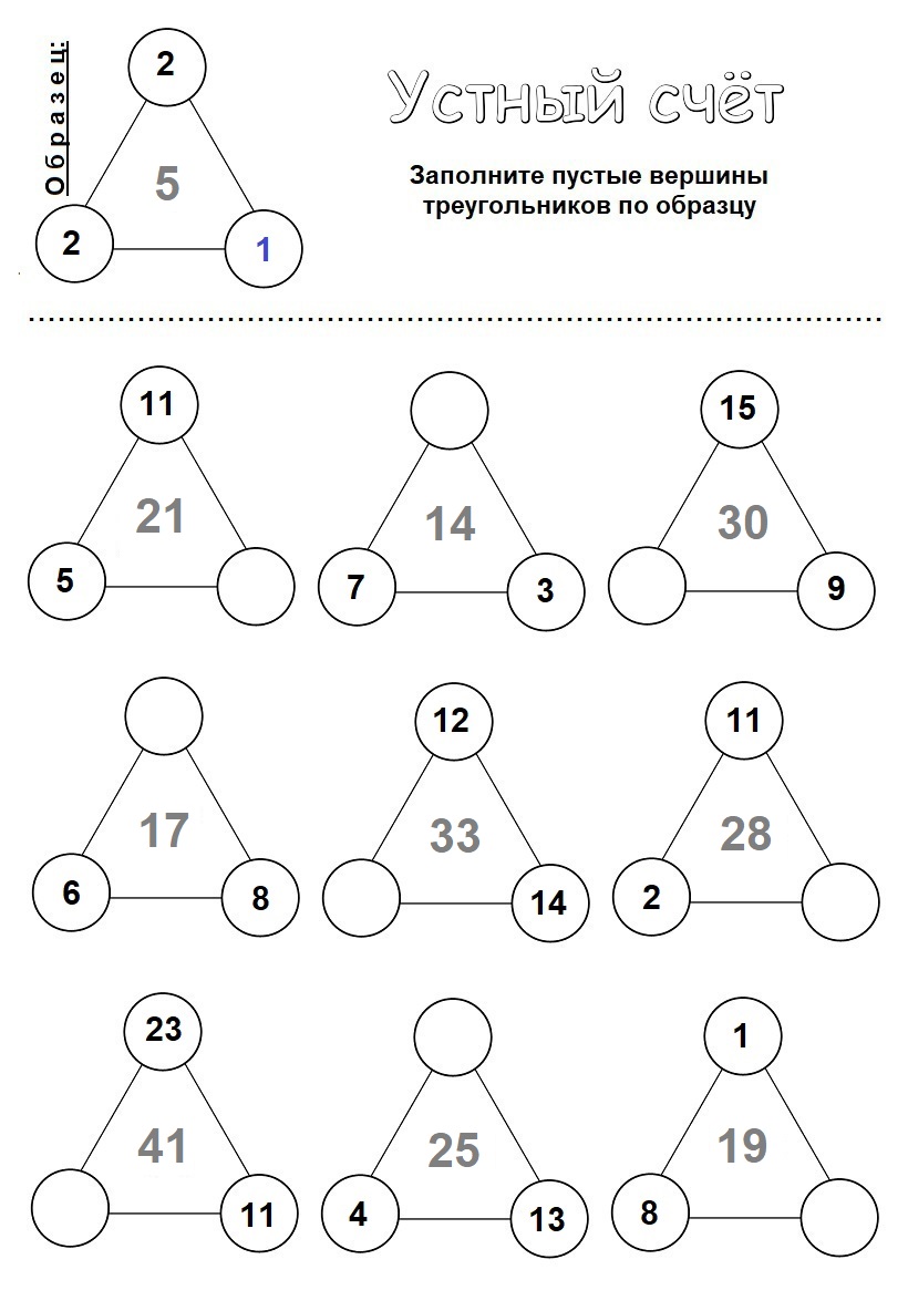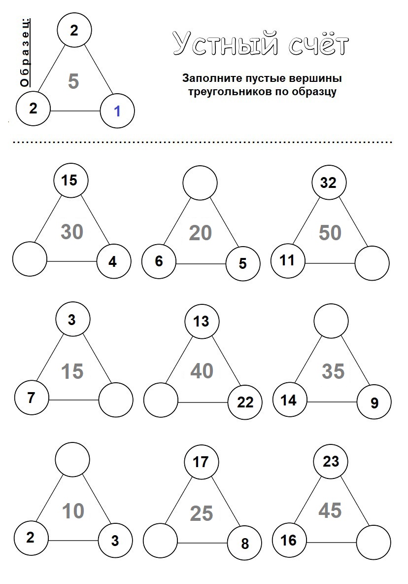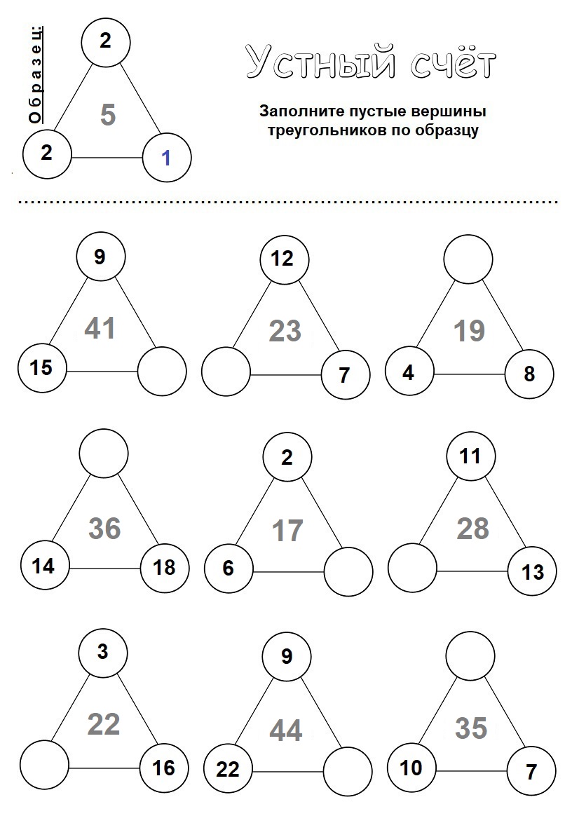 Описание ресурса | Задание представлено в виде треугольника, вершины которого – слагаемые, а число в центре – значение суммы. Обучающемуся нужно найти неизвестное слагаемое любым способом. Например, так: На каждом рабочем листе девять таких заданий-треугольников. Для выполнения упражнения детям потребуется рабочий лист и ручка (или карандаш) Лист №1 Ссылка для скачивания: https://images.vfl.ru/ii/1753076432/6043e7b8/39911351.jpg Ключ: Лист №2 Ссылка для скачивания задания https://images.vfl.ru/ii/1753076643/c6b6728d/39911352.jpg Ключ: Лист №3 Ссылка для скачивания задания https://images.vfl.ru/ii/1753076863/33be24ec/39911353.jpg Ключ: |